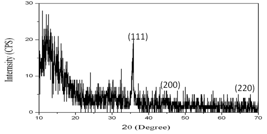Insert fig. 3 shows the XRD pattern of Carica papaya aqueous extract based synthesized silver nanoparticles which exhibits strong and broad diffraction peaks at and= θ2 24.9 41.30. The four other characteristic peaks showed in the case of Ag ° nanocomposite hydrogel indicates the face-centred cubic (fcc) structure. The diffraction peaks at and= θ2 38.9,44.62 and 64.9 corresponding to the reflections of crystal planes (1 1 1), (2 0 0) and (2 2 0) respectively. This face-centred cubic (fcc) structure indicates that Ag0 nanoparticles were dispersed in the Carica papaya aqueous extract based synthesized silver nanoparticles by the bioreduction method. Similar results were reported by [42, 43], these author’s biosynthesized AgNPs using Cinnanonum camphora and marine algae (Sargassum polycystum and Sargassum longifolium) extract compound respectively.