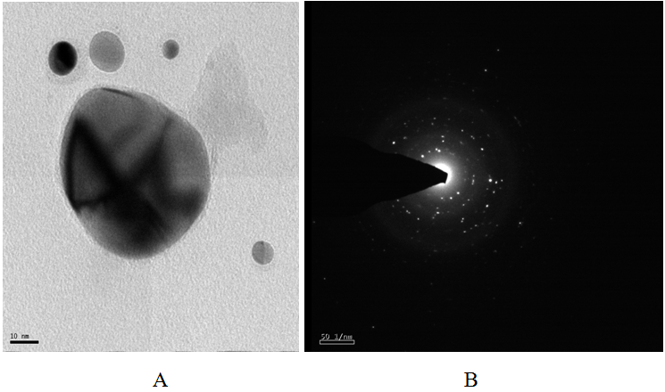 Fig. 4: A-HR-TEM image of Carica papaya aqueous extract based synthesized silver nanoparticles and the B-SAED pattern image of Carica papaya aqueous extract based synthesized silver nanoparticles