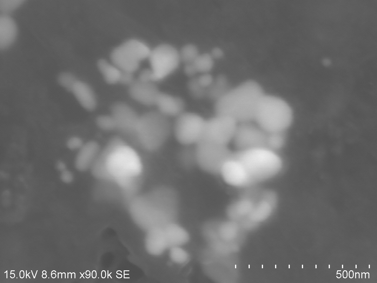 HR-TEM analyses showed the particle size 10 nm with a spherical morphology and the SAED pattern reveals that nanoparticles are polydispersive in nature (fig. 4 A and B. The FESEM image of synthesized silver nanoparticles also showed the sperical shaped nanoparticles with the aggregation (fig. 5). The EDX spectrum also confirms the bio reduction of silver nanoparticles with the peaks of silver and oxygen and this may be due to the surface plasmon resonance (SPR) (fig. 6). The FE-SEM image has clearly proved the bio reduction of Ag+to Ag ° by the formation of spherical ovoid morphology. Overall the size and morphology distribution of AgNPs was found to be below 100 nm.