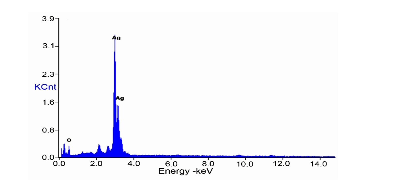 Results: SPR confirmed the formation of AgNPs in UV-Visible spectra at 445.7 nm. The XRD result also showed the presence of elemental Ag+as a crystalline nature. Study the functional groups responsible for the bio reduction of Ag+. HE-TEM and FE-SEM with EDX image showed spherical crystalline AgNPs.
