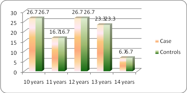 Out of 30 asthmatic children 8 (26.7%) were in the age group of 10 y, 5 children (16.7%) were in the age group of 11 y, 8 children (26.7%) were 12 y of age group, 7 children (23.3%) were 13 y of age group, 2 children (6.7%) were 14 y of age group. Out of 60 non asthmatic 16 children (26.7%) were 10 y of age group, 10 children (16.7%) were 11 y of age group, 16 children (26.7%) were 12 y of age group, 14 children (23.3%) were 13 y of age group, 4 children (6.7%) were 14 y of age group. From the analyzed data we found that the age group of 10 y and 12 y were more exposed to the asthma. Table 1 given below show the detail.