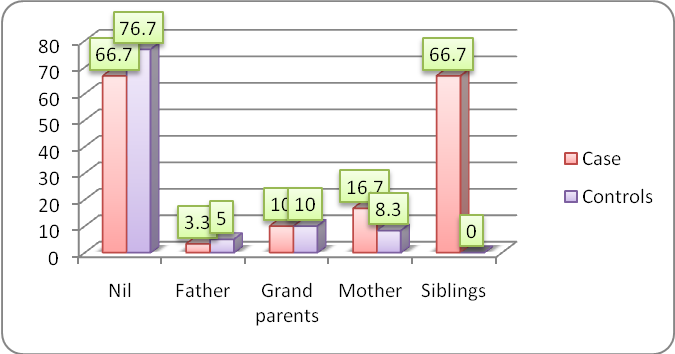 Out of 30 asthmatic 20 children (66.7%) were not having relation, 1 children (3.3) relation with father, 3 children (10.0) relation with grandparents, 5 children (16.7) relation with mother, 20 children (66.7) relation with Siblings.