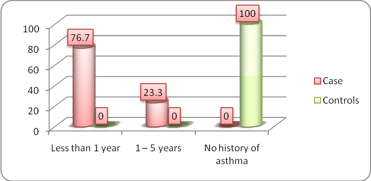 Out of 30 asthmatic 23 children (76.7%) were Less than 1 y duration of asthma, 7 children (23.3%) with 1–5 y duration of asthma. out of 60 non asthmatic 60 children(100%) No his-tory of asthma. χ2 value= 90.0df=2p value= 0.000, Sig.