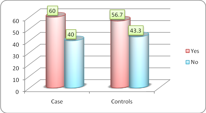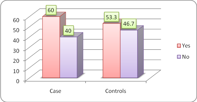 χ2 value= 0.36df=1p value= 0.549, NS Odd’s ratio= 1.31