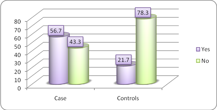 χ2 value= 11.025 df=1 p value= 0.001, Sig Odd’s ratio= 4.72