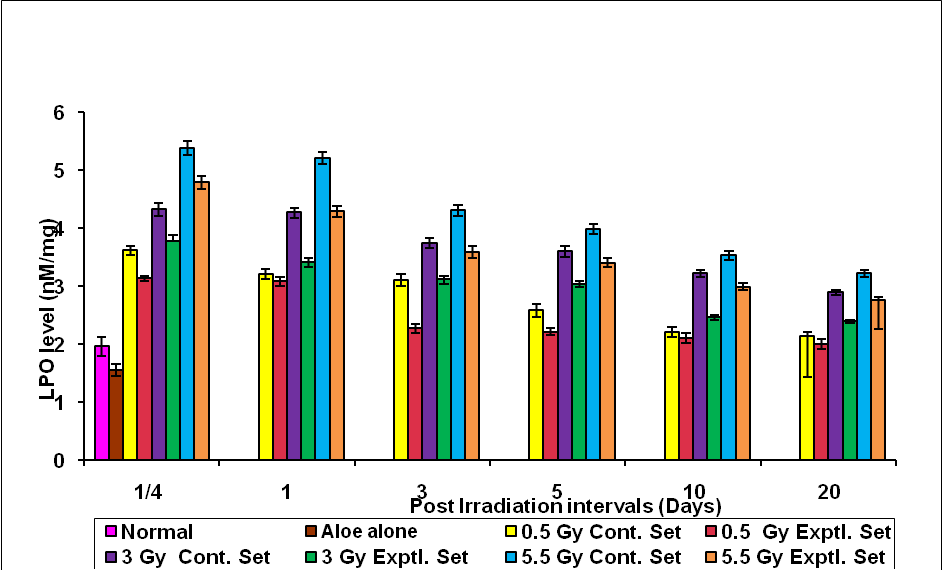 Results of the present study showed that lipid peroxidation LPO level was maximum in the liver of all irradiated alone mice controls sets at 6 h postirradiation. Thereafter, LPO level decreased continuously at all successive autopsy intervals and returned almost to normal at day 20 in 0.5 Gy exposed mice, while in 3 and 5.5 Gy exposed mice it was still 1.47 and 1.64 folds higher than normal level table 2, fig. 1. Increase in LPO level with an increase of exposure dose of radiation suggested increased peroxiadation of membrane lipids in the liver. Radiation exposure resulted in a considerable rise in LPO level in blood, which increased up to day 7 in both experimental and control groups being significantly higher p<0.001 in control group than the respective experimental group [15]. Afterwards, these values started to decrease in both the groups and tend to be normalized. Although the values were significantly lower p<0.01 in experimental animals than irradiated controls, but the normal level could not be recovered even by the end of experimentation and found 109.56% higher than the normal. Garcinia indica as the modulation of the radiation-induced decrease of reduced glutathione and the radiation-induced increase in lipid peroxidation assessed in the liver and the blood [16].