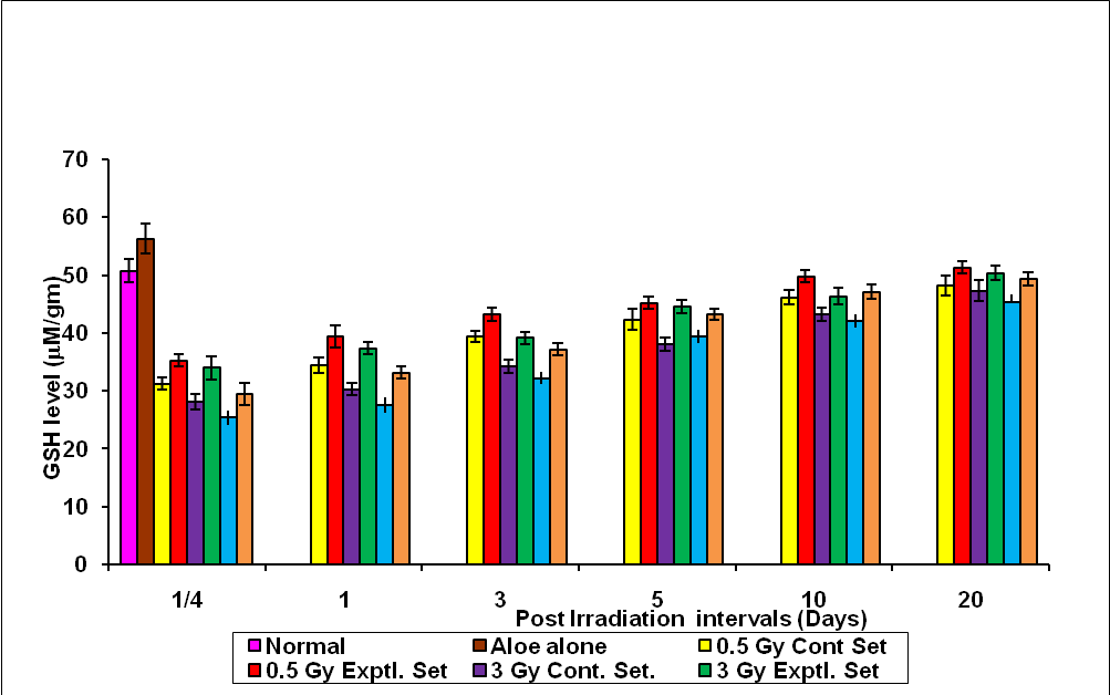 In Aloe pretreated 0.5, 3 and 5.5 irradiated animals GSH contents also decreased and found to be 66.86, 64.45 and 55.85 percent at first autopsy interval. However, a decrease in GSH was significantly lesser p<0.05 than that of the without Aloe pretreated irradiated animals. Thereafter, GSH increased gradually and reached at a peak level 97.28, 95.43 and 93.52 % at day 20 of this study which was significantly higher p<0.05 than that of their respective control set table 2, fig. 2.