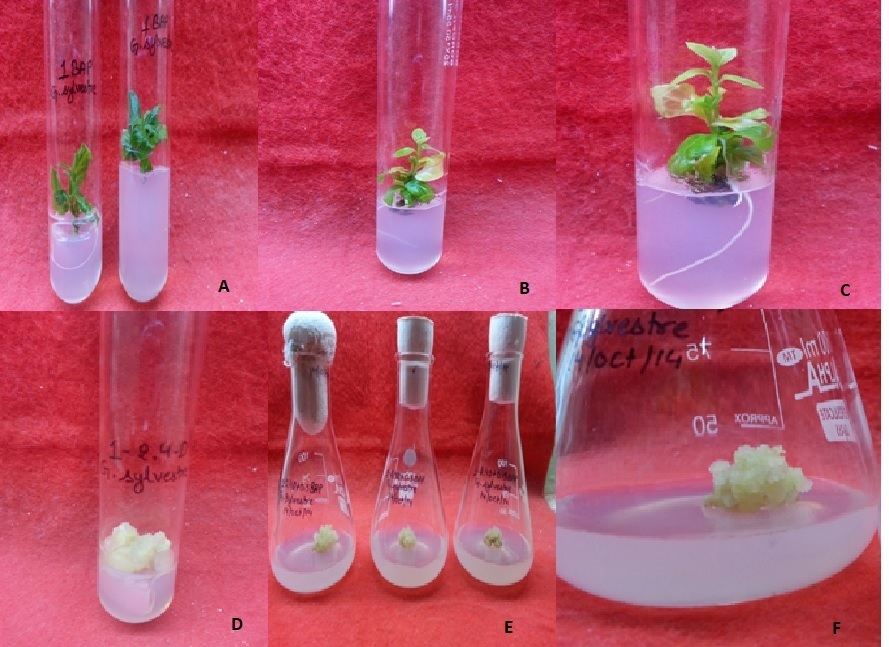 A. shoot multiplication on MS medium supplemented with 1.0 mg/l BAP, B. Shoot multiplication on medium supplemented with 2.0 mg/l Kn, C. Root induction on MS medium fortified with 2.0 mg/l IBA, D. Callus induction on MS medium supplemented with 1 mg/l 2,4-D, E. Callus multiplication on MS medium supplemented with 1 mg/l 2,4-D+0.5 mg/l BAP, F. Callus proliferation on MS medium Supplemented with 1.0 mg/l 2,4-D+1.5 mg/l Kn.