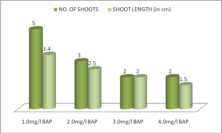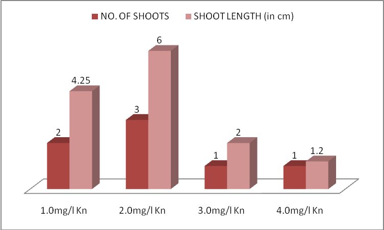 When explants were inoculated on Kn then the maximum number of shoots were obtained on its 2.0 mg/l concentration (maximum no. of shoot 3.0±1.5 and shoot length 6.0±1.1 cm) (table 2, fig. 1-B and 3). Kn proved to be a better choice than BAP.