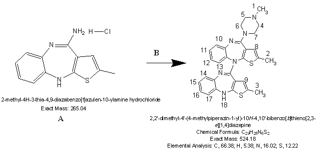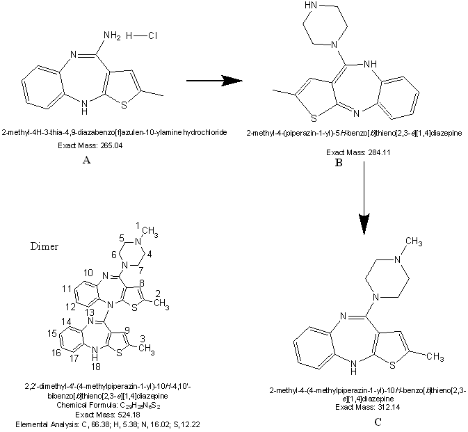 Any residual of A present in the reaction reacts with compound B to give bis-[10-(2-methyl-4H-3-thia-4,9-diazabenzo[f]azulene)]-1,4-piperazine (Dimer impurity). This impurity is formed only in trace quantities.