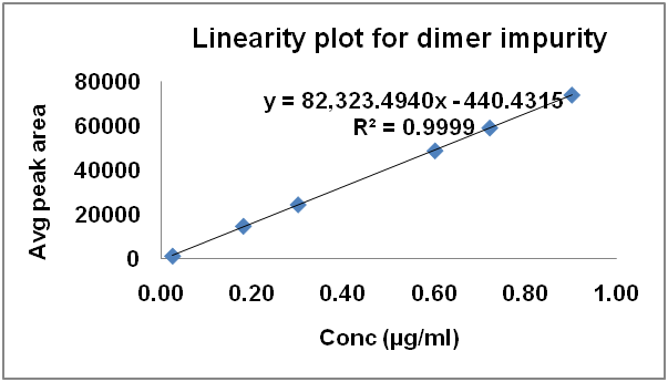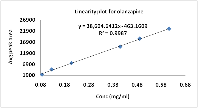 Good linearity of (bis-[10-(2-methyl-4H-3-thia-4,9-diazabenzo [f] azulene)]-1,4-piperazine was evaluated over six levels of bis-[10-(2-methyl-4H-3-thia-4,9-diazabenzo[f]azulene)]-1,4-piperazine solutions from 0.025 µg/ml to 0.903 µg/ml, with the linear regression equation y = mx+c, where x is the concentration in µg/ml, and y is the corresponding peak area of bis-[10-(2-methyl-4H-3-thia-4,9-diazabenzo[f]azulene)]-1,4-piperazine in mV/s. We observed linear results with respect to concentration for bis-[10-(2-methyl-4H-3-thia-4,9-diazabenzo[f] azulene)]-1,4-piperazine. The correlation coefficient value is more than 0.999. The linearity results of bis-[10-(2-methyl-4H-3-thia-4,9-diazabenzo[f]azulene)]-1,4-piperazine and Olanzapine are given in table 2 and in table 3. The linearity graph was shown in fig. 3 and in fig. 4 correspondingly.