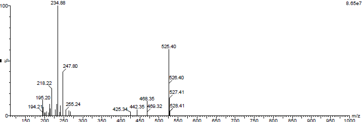 Mass spectral data identified the structure of bis-[10-(2-methyl-4H-3-thia-4,9-diazabenzo[f]azulene)]-1,4-piperazine, which was reported in fig. 1A. A [M+H]+molecular ion peak was identified in positive ionization mode at m/z 525.4 corresponding to bis-[10-(2-methyl-4H-3-thia-4,9-diazabenzo[f]azulene)]-1,4-piperazine captured in fig. 5.