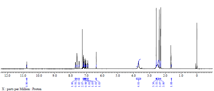 Proton NMR experiments were performed using 300 MHz FT-NMR spectrometer (Bruker, BioSpin Corporation, Billerica, MA, USA) in CDCl3 at 25 °C temperature. The chemical shifts of protons were reported on the δ scale in ppm relative to TMS and CDCl3 respectively. The 1H NMR spectrum of bis-[10-(2-methyl-4H-3-thia-4,9-diazabenzo[f]azulene)]-1,4-piperazine fig. 6, exhibits a characteristic methylene proton (s–6H) chemical shift at 2.2–2.3, characteristic CH2 proton (m-8H) chemical shift 3.2–3.5, characteristic aromatic proton (s-2H) chemical shift at 6.4, characteristic aromatic proton (m-8H) chemical shift at 6.7–6.9 and characteristic NH proton (s-2H) chemical shift at 7.7. The NMR data for the bis-[10-(2-methyl-4H-3-thia-4,9-diazabenzo[f]azulene)]-1,4-piperazine was given in table 9.