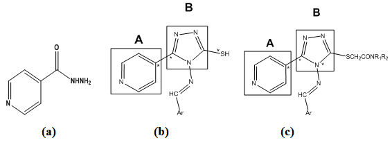 Fig. 1: Proposed pictorial representation of the proposed hypothesis. a) Chemical structure of the Isoniazid b) and c) are proposed compounds scheme for the designing of the 1,2,4-triazole compounds