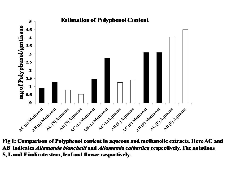 Crude aqueous and organic flower extracts of these two plant species possess higher amount of polyphenol as indicated in fig. 1. Polyphenol content in the aqueous flower extracts of Allamanda blanchetii was found to be 4.5054 mg/gm tissue, while in Allamanda cathartica the level was observed at 4.04794 mg/gm tissue. The organic extracts A. blanchetii and A. cathartica both contained 3.1074 mg/gm tissue of polyphenol. In case of leaf and stem methanolic extracts showed higher amount of polyphenol content than aqueous extracts. Aqueous leaf extracts of Allamanda blanchetii extract contained 1.4018 mg/gm tissue of polyphenol where as Allamanda cathartica contained 1.2532 mg/gm tissue of polyphenol. In methanolic extracts the polyphenol amount was 2.7438 mg/gm tissue in purple allamanda and 2.7438 mg/gm tissue in the yellow one. The organic stem extracts contain 1.2744 mg/gm tissue and 0.9027 mg/gm tissue of polyphenol in purple and yellow allamanda respectively.