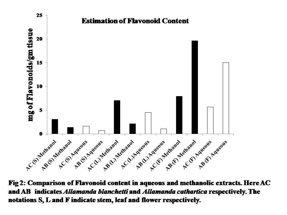 Conclusion: The flower of Allamanda cathartica and Allamanda blanchetii has higher amount of flavonoids, polyphenols, polysaccharide and the floral extracts display comparatively higher anti-oxidant property.