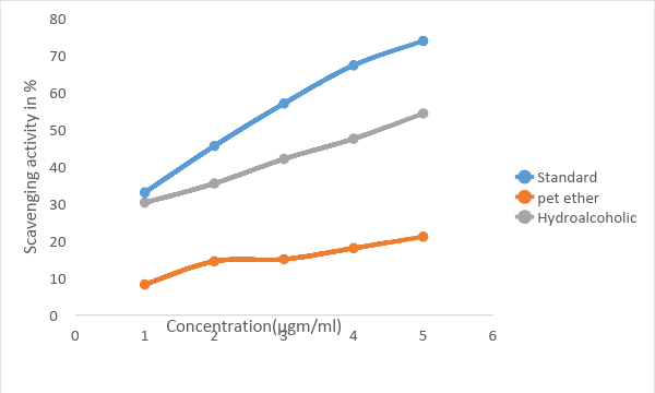 Results: In the current investigation it has been found that the Pet. Ether and Hydroalcoholic extracts showed potent antioxidant activity by reducing power, as the concentration of the extracts increased, the absorbance was also increased correspondingly.