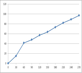 The abdominal skin of Albino mice, weighing 20–25 gm of 8–10 w old was shaved using hand razor and clean the skin with hot water cotton swab. 5 gm of gel was applied uniformly to the skin. The skin was mounted between the compartments of the Frantz diffusion cell with stratum corneum facing the donor compartment. Reservoir compartment was filled with 100 ml phosphate buffer of pH 6.8. The study was carried out at 37±1 °C and the speed was adjusted until the vortex touches the skin and it carried out for 4½ h. 5 ml of the sample was withdrawn from the reservoir compartment at 30 min interval and absorbance was measured spectrophotometrically at 260 nm. Each time the reservoir compartment was replenished with the 5 ml volume of phosphate buffer pH 6.8 solution to maintain a constant volume.