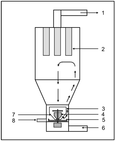 Fig. 1: Schematic representation of a complex fluidized-bed granulator, 1: Exhaust air, 2: Bag filter, 3: Partition tube, 4: Impeller, 5: Rotor disc, 6: Inlet air, 7: Screen, 8: Spray nozzle
