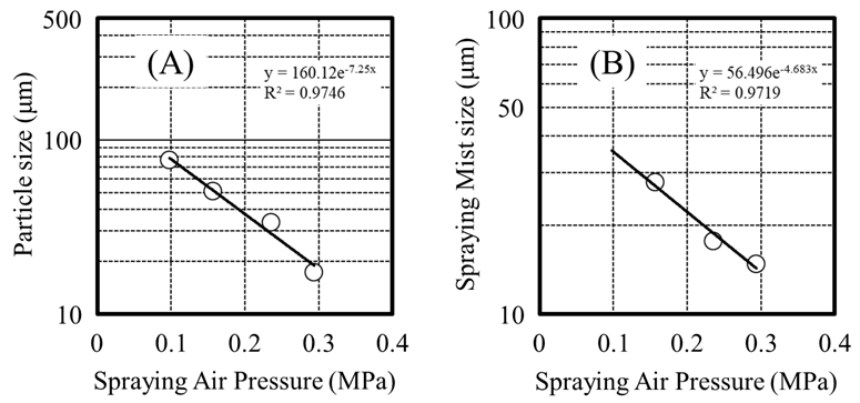 The relationship between spraying air pressure and spraying mist size is shown in fig. 2-B. The spraying mist size also decreased exponentially in this region. On the coating process for fine particles, smaller particles can be obtained as the spraying mist size is smaller.