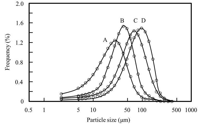 Fig. 3: Particle size distributions of treated FAM prepared using a complex fluidized-bed granulator (SFP-01) at various spraying air pressures, A: 0.29 MPa, B: 0.24 MPa, C: 0.16 MPa, D: 0.10 MPa