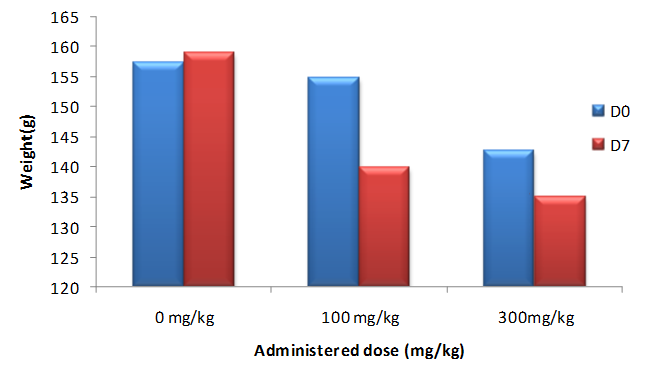 Fig. 2: Evolution of the weight of normal control rats and those treated with the hydroethanolic extract of the leaves and stems of tridaxprocumbens during 07 d