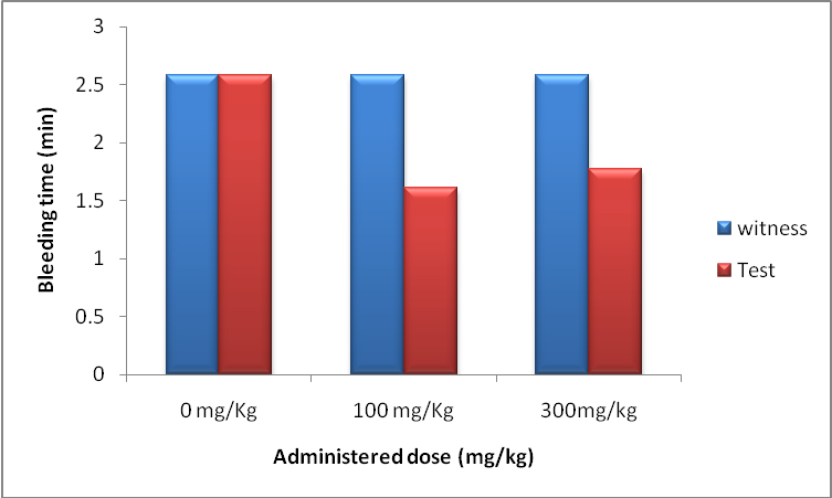 The results obtained show that the bleeding time without the extract is 2.58±0.31 min while the average bleeding time after treatment with the extract is 1.61±0.70 min at a dose of 100 mg./kg PC and 1.77±0.69 min at a dose of 300 mg/kg PC. Thus the extract significantly lowers the bleeding time. These results are comparable to those of Adogo J. L. [35]. Who found that the average bleeding time without the extract is 2.49±0.09 and that treated with the extract is 1.40±0.16 min