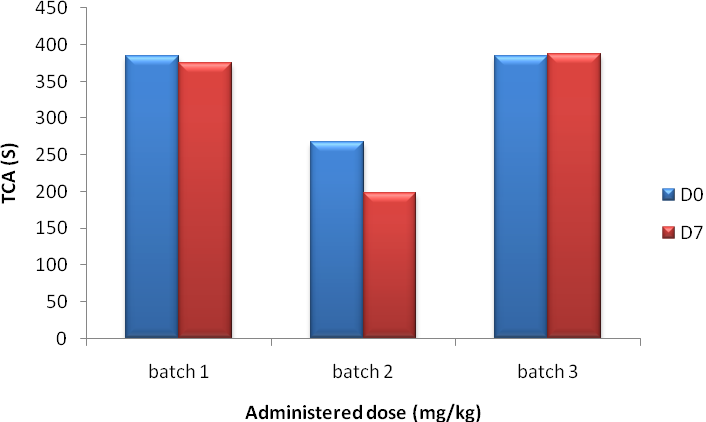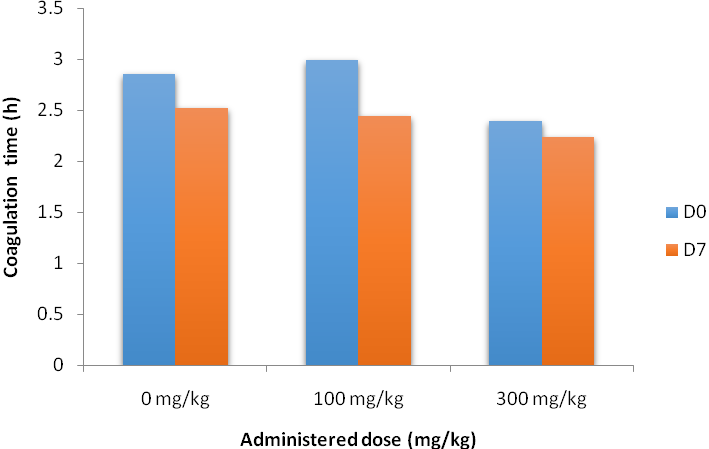 Coagulation time decreased in all rats treated with the extract. The coagulation time at D0 is on average 2.85±0.13 min at D0 and 2.52±0.24 min at D7 for the control rats. For those treated with the extract, the mean clotting time is 2.99±0., 16 min at D0 and 2.44±0.54 min at D7 at a dose of 100 mg/kg PC, 2.39±0.25 min at D0 and 2.24±0.29 min at D7 at a dose of 300 mg/kg PC. Thus the extract significantly reduces the coagulation time. These results are comparable to those of Kukwa D T [35], who proved that the clotting time decreased steadily as the dosage of the applied extract increased.