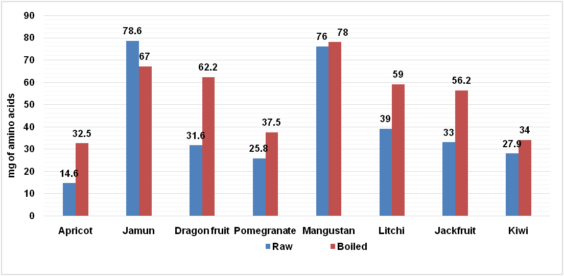 Results: Both raw and boiled forms which showed thats Jamun and Mangustan contained highest concentration amino acids whereas apricot shows the lowest concentration of amino acids except in Jamun which showed higher values in the raw fruit whereas in others the boiled samples showed higher values.