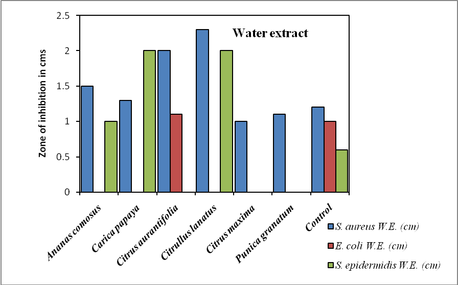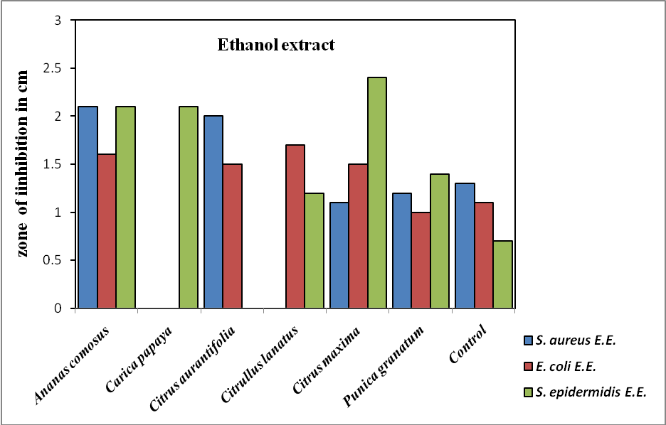 ii) S. epidermidis: The zone of inhibition against S. epidermidis was maximum in Carica papaya (2.0 cm) and Citrullus lanatus (2.0) followed by Ananas comosus (1.0 cm). No result was shown by Citrus aurantifolia (0 cm), Citrus maxima (0 cm) and Punica granatum (0 cm).