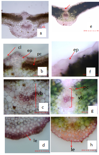 Fig. 2:T. S of Leaf (1) M. emarginata (a–d) (2) C. asiatica (e-h), aande: portion enlarged, b: Cuticle (cl), epidermis (ep), palisade cell (pc), c: vascular bundle (vb), dandh: lower epidermis (le), f: epidermis (ep), g: vascular bundle (vb), palisade cell (pc)