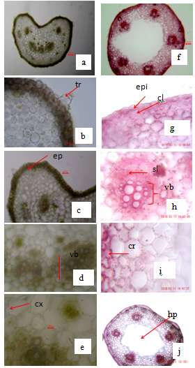 Fig. 3: T. S of Petiole (1) M. emarginata (a–e) (2) C. asiatica (f-j), aandf: enlarged portion, b: trichome (tr), c: epidermis (ep), d: vascular bundle, e: cortex (cx), g: epidermis (ep), collenchyma (cl), h: vascular bundle (vb), sclereids (sl), i: crystal (cr), j: hollow pith
