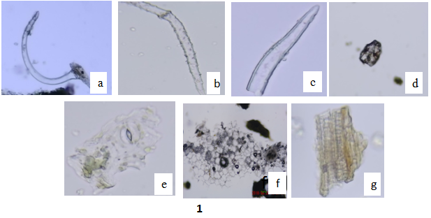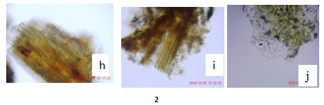 Fig. 4: Powder microscopy (1) M. emarginata (a-g) (2) C. asiatica (a-c), a-c: trichomes, d: calcium oxalate crystal, e: anomocytic stomata, f: spongy parenchyma with chloroplast, gandi: tracheid with spiral thickening, h: parenchyma cell, j: paracytic stomata