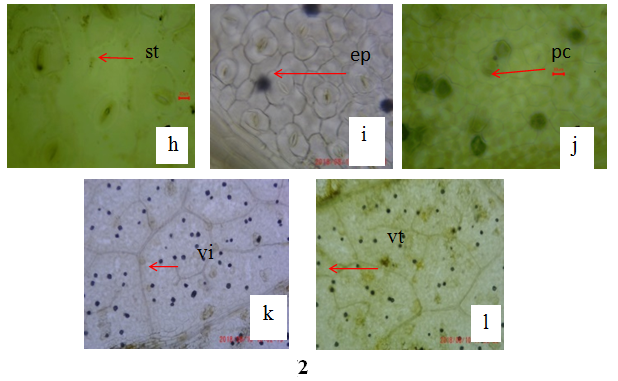 Fig. 5: Leaf constants (1) M. emarginata (a–g) (2) C. asiatica (h–l), a: anomocytic stomata (st), bandi: epidermis (ep), c: trichome with base (tb), d: trichome, eandj: palisade cell (pc), fandk: vein islet (vi), gandl: veinlet termination (vt), h: paracytic stomata