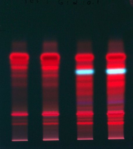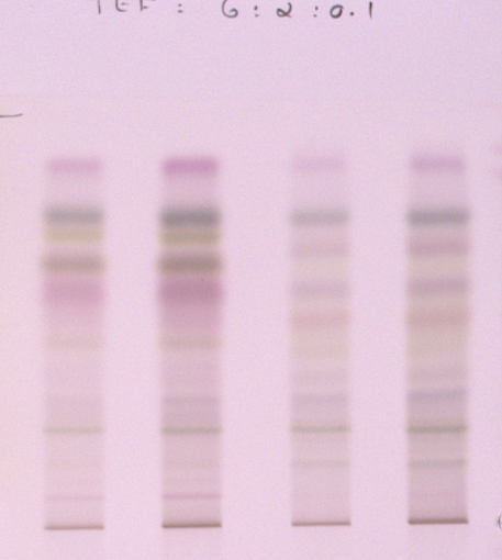 Viewed under white light after derivatisation using vanillin-sulphuric acid