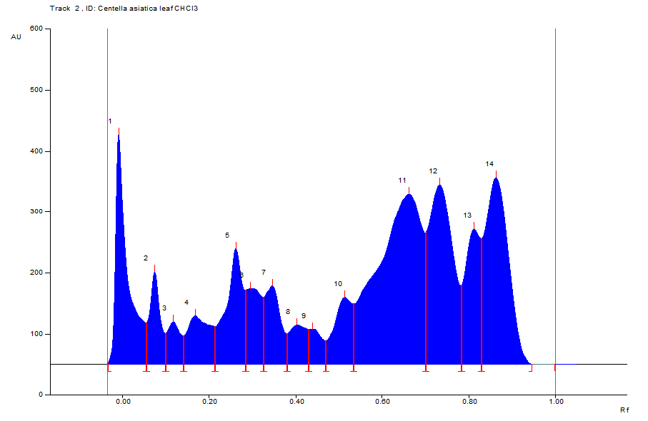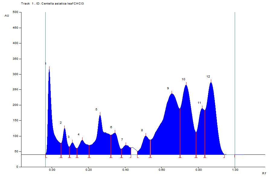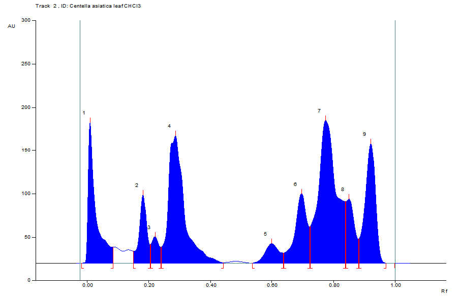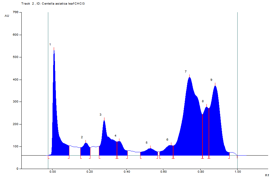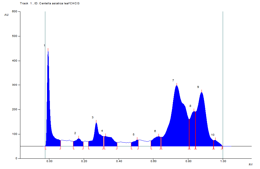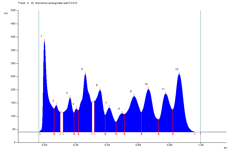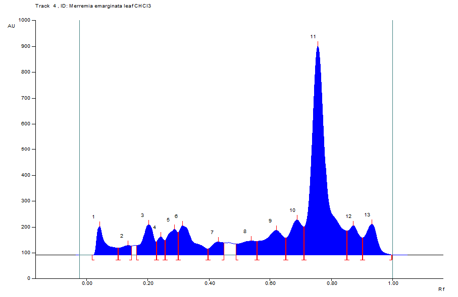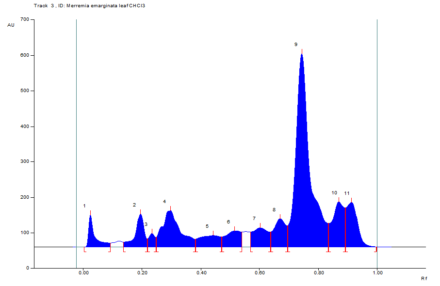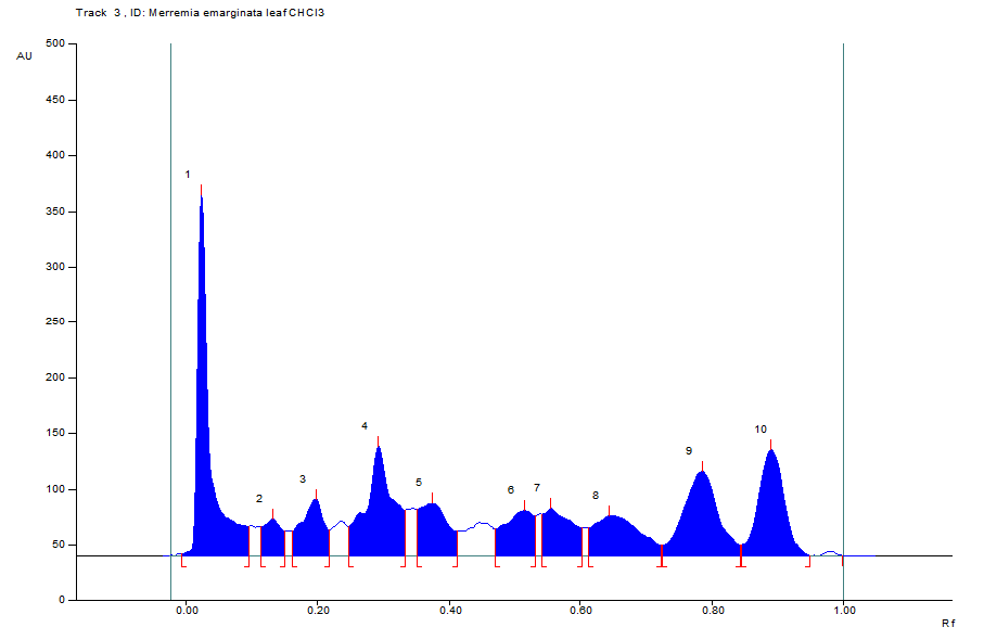 The HPTLC fingerprint profile and Rf table of chloroform extract of leaves of M. emarginata and C. asiatica at UV 366 nm are represented in fig. 8(1) and fig. 8(2) respectively.