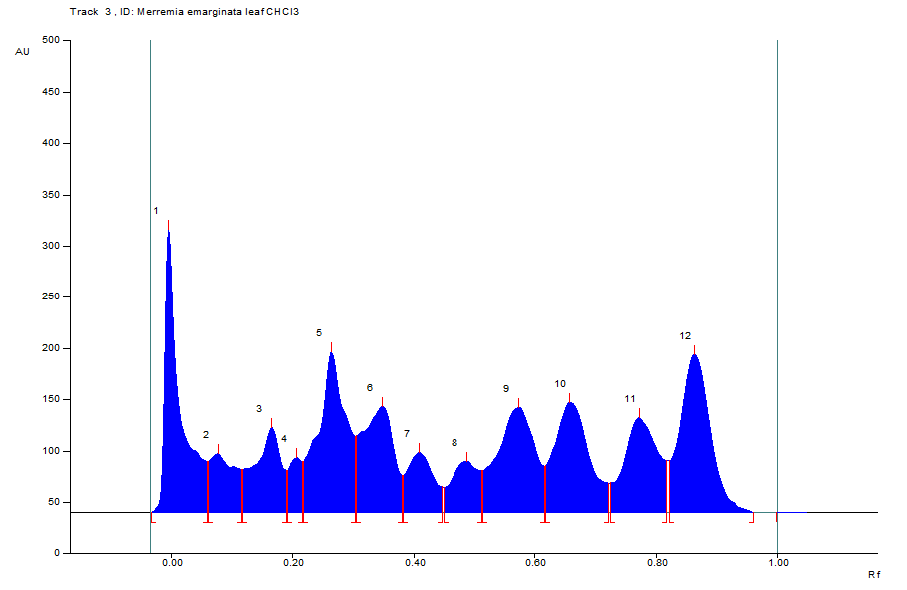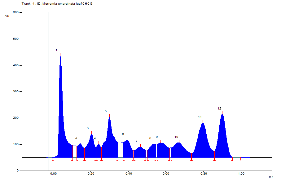 HPTLC for identification of chemical constituents in the plant extracts typically produces fingerprints, ie. sequence of zones that have specific positions, colours and intensity. The fingerprints obtained for the chloroform extracts of the leaves of M. emarginata and C. asiatica were compared and found that they are chemically different. These results are used to differentiate the two plant materials even though they are having similar morphological characteristics.