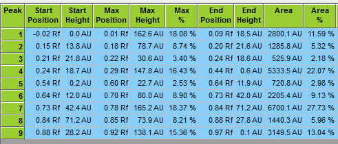 Fig. 9(2): Fingerprint profile and Rf table of chloroform extract of C. asiatica (leaf) at 575 nm after derivatization
