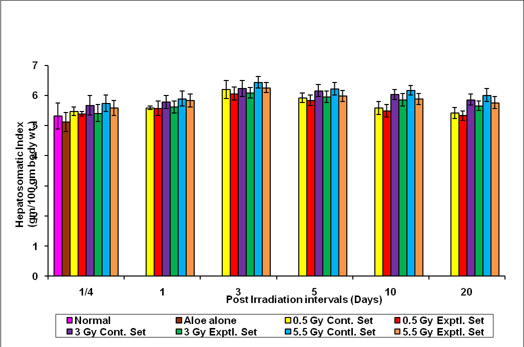 The increasing pattern persisted and a peak (117.06 %) was seen at day 3. Later, a declining trend was noticed but did not return to the normal level and remained higher (nonsignificant) up to last autopsy interval (day 20). Value of hepatosomatic index in experimental set (Aloe treatment+3 Gy) was increased from 6 h to day 3 and measured as 101.65, 105.59 and 114.43 percent at 6 h, day 1 and 3 post-irradiation respectively. But each value was found to be significantly lower than its respective control set. Thereafter, it declined progressively from day 5 to last autopsy interval and found 106.32 percent at day 20.