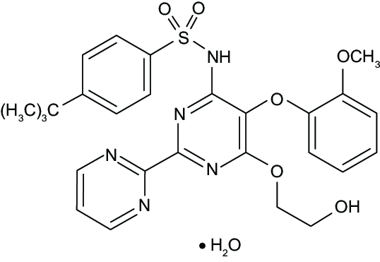 Bosentan monohydrate chemically 4-tert-butyl-N-[6-(2-hydroxy-ethoxy)-5-(2-methoxyphenoxy)-2-pyrimidin-2-ylpyrimidin-4-yl] benzene sulfonamide hydrate is dual Endothelin Receptor Antagonist (ERA) with molecular formula of C27H29N5O6 S·H2O [1]. It is used to treat Pulmonary Arterial Hypertension (PAH) and chronic heart failure. It is a specific and competitive antagonist of endothelin-1 which is potent endogenous vasoconstrictor acting on both endothelin A and endothelin B receptors of the smooth muscles of pulmonary blood vessels leading to high blood pressure [2, 3]. Bosentan has a slightly higher affinity for ETA receptors than for ETB receptors. ET-1 concentrations are elevated in plasma and lung tissue of patients with pulmonary arterial hypertension, suggesting a pathogenic role for ET-1 in this disease [4]. Bosentan blocks the binding of endothelin to its receptors, thereby eliminating endothelin's deleterious effects [5].
