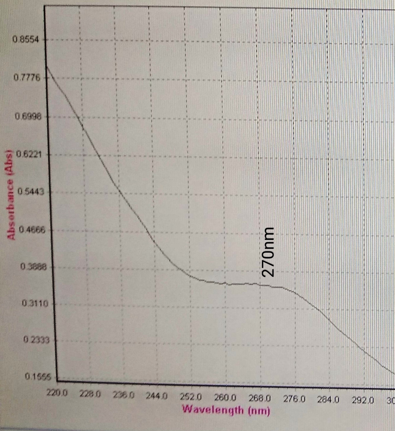 The λmax (wavelength of maximum absorption) of bosentan was determined by scanning 10 μg/ml solution of the drug (ethanol used as diluent) using UV-Visible spectrophotometer within the wavelength region of 220 to 400 nm against ethanol as blank. The absorption curve (fig. 1) showed characteristic absorption maxima at 270 nm for Bosentan.