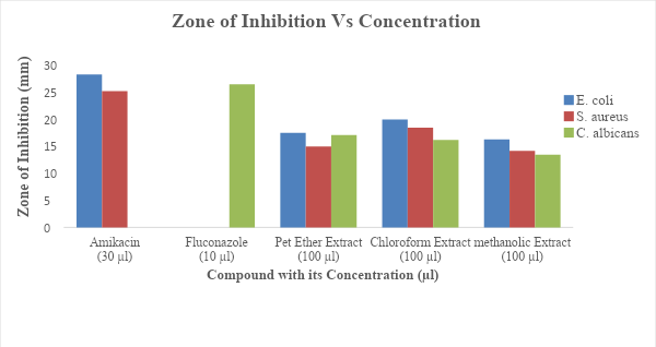 Whereas in the case of fungal strain petroleum ether extract showed the highest inhibitory activity, chloroform extract exhibit moderate anti-fungal activity and the methanolic extract exhibit lowest anti-fungal activity. The result was shown in table 4.