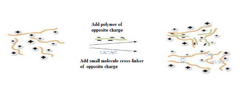 In Ionic cross linking polymer undergo phase transition in different ions due to this gels are formed. Mostly the polysaccharides are from the ion-sensitive ones, i-carrageenan forms elastic gels mainly in the presence of Ca2+and K–carrageen forms brittle and rigid gels in presence of small amount of K+. Gellan gum is a polymer which expressed in the name of Gelrite is an anionic polysaccharide which is widely used, that undergoes in-situ gelling in the presence of mono-and divalent cations, including K+, Ca2+, a Na+and Mg2+, Gelation of the low-methoxypectins can be caused by divalent cations, especially Ca2+. Likewise, alginic acid undergoes gelation in presence of divalent/polyvalent cations e+-g. Ca2+due to the interaction with glucoronic acid block in alginate chains.