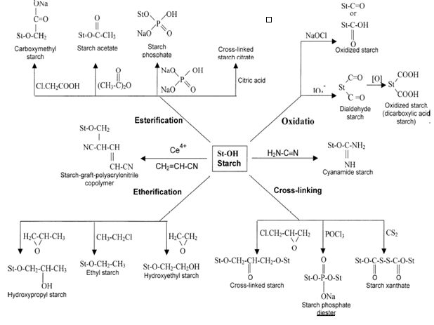 This method primarily includes substitution of hydrophilic hydroxyl groups of starch by various hydrophobic functional groups resulting into hyproxypropylation, carboxymethylation, acetylation, succinylation, etc. The carboxymethyl substitution of starch hydroxyl groupsgives rise to derivatives that are cold water-soluble. Toprevent starch gelatinization, the reaction has to be carriedout in an organic medium. Carboxymethyl starch, under thename sodium starch glycolate, is used in the pharmaceuticalindustry as a disintegrant and as a sizing and printing agent inthe textile industry. Highly substituted derivatives arepossible.