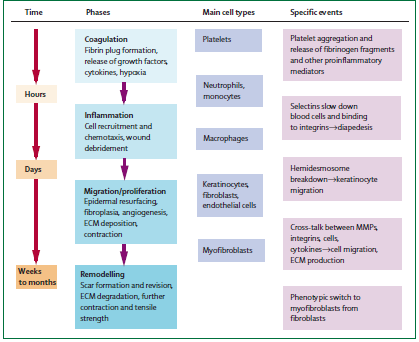 Fig. 2: Phases of wound healing, major types of cells involved in each phase, and selected specific events