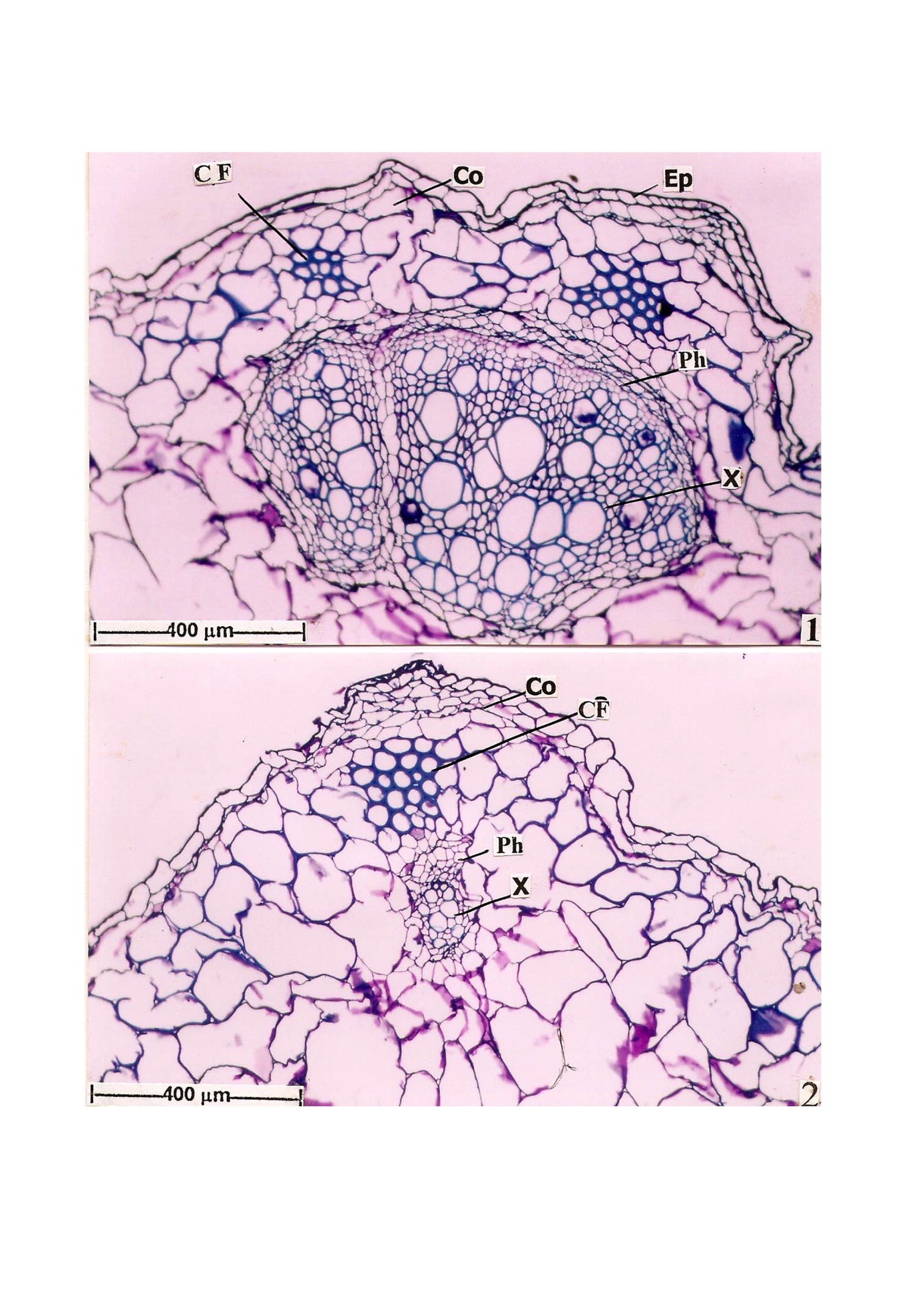 Fig. 3: T. S. of Stem–Structure of Vascular bundles, 1. One larger bundle enlarged, 2. One Smaller bundle enlarged