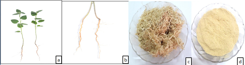 Fig. 1: Morphology of Sida cardifolia (a. Whole plant, b. Fresh Root, c. Dried Roots, d. Root powder