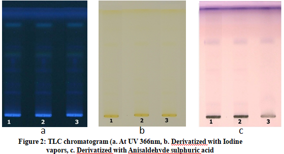 Fig. 2: TLC chromatogram (a. At UV 366 nm, b. Derivatized with Iodine vapors, c. Derivatized with anisaldehvde sulphuric acid