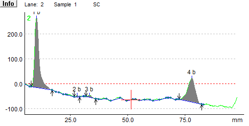 | Peak no | Y-Pos | Area | Area (%) | Height | Rf value |