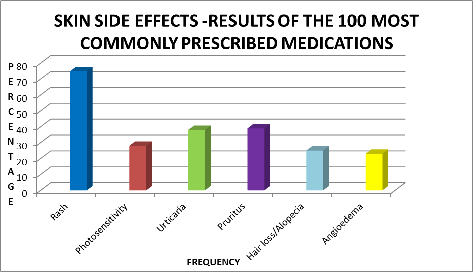 Conclusion: The top 100 prescribed medication cause a number of dermatological side effects that need to be considered when they are prescribed to patients who have pre-existing skin conditions. Additionally, when confronted with a common dermatological problem in any patient, clinicians should always consider the possibility of a drug adverse reaction.